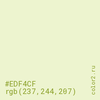 Цвет #EDF4CF в цветовой модели RGB обозначается тремя октетами (237, 244, 207) в десятичном формате и #EDF4CF в шестнадцатиричном (hex) формате, которые являются интенсивностью красного 237 (hex ED), интенсивность зелёного 244 (hex F4) и интенсивность синего 207 (hex CF).