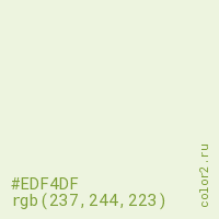 Цвет #EDF4DF в цветовой модели RGB обозначается тремя октетами (237, 244, 223) в десятичном формате и #EDF4DF в шестнадцатиричном (hex) формате, которые являются интенсивностью красного 237 (hex ED), интенсивность зелёного 244 (hex F4) и интенсивность синего 223 (hex DF).