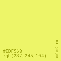 Цвет #EDF568 в цветовой модели RGB обозначается тремя октетами (237, 245, 104) в десятичном формате и #EDF568 в шестнадцатиричном (hex) формате, которые являются интенсивностью красного 237 (hex ED), интенсивность зелёного 245 (hex F5) и интенсивность синего 104 (hex 68).