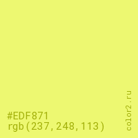 Цвет #EDF871 в цветовой модели RGB обозначается тремя октетами (237, 248, 113) в десятичном формате и #EDF871 в шестнадцатиричном (hex) формате, которые являются интенсивностью красного 237 (hex ED), интенсивность зелёного 248 (hex F8) и интенсивность синего 113 (hex 71).