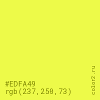 Цвет #EDFA49 в цветовой модели RGB обозначается тремя октетами (237, 250, 73) в десятичном формате и #EDFA49 в шестнадцатиричном (hex) формате, которые являются интенсивностью красного 237 (hex ED), интенсивность зелёного 250 (hex FA) и интенсивность синего 73 (hex 49).