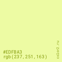 Цвет #EDFBA3 в цветовой модели RGB обозначается тремя октетами (237, 251, 163) в десятичном формате и #EDFBA3 в шестнадцатиричном (hex) формате, которые являются интенсивностью красного 237 (hex ED), интенсивность зелёного 251 (hex FB) и интенсивность синего 163 (hex A3).