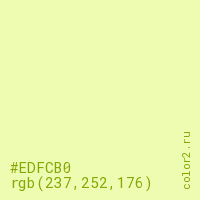 Цвет #EDFCB0 в цветовой модели RGB обозначается тремя октетами (237, 252, 176) в десятичном формате и #EDFCB0 в шестнадцатиричном (hex) формате, которые являются интенсивностью красного 237 (hex ED), интенсивность зелёного 252 (hex FC) и интенсивность синего 176 (hex B0).