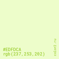 Цвет #EDFDCA в цветовой модели RGB обозначается тремя октетами (237, 253, 202) в десятичном формате и #EDFDCA в шестнадцатиричном (hex) формате, которые являются интенсивностью красного 237 (hex ED), интенсивность зелёного 253 (hex FD) и интенсивность синего 202 (hex CA).