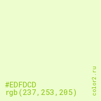 Цвет #EDFDCD в цветовой модели RGB обозначается тремя октетами (237, 253, 205) в десятичном формате и #EDFDCD в шестнадцатиричном (hex) формате, которые являются интенсивностью красного 237 (hex ED), интенсивность зелёного 253 (hex FD) и интенсивность синего 205 (hex CD).