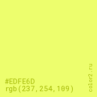 Цвет #EDFE6D в цветовой модели RGB обозначается тремя октетами (237, 254, 109) в десятичном формате и #EDFE6D в шестнадцатиричном (hex) формате, которые являются интенсивностью красного 237 (hex ED), интенсивность зелёного 254 (hex FE) и интенсивность синего 109 (hex 6D).