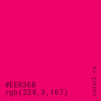 Цвет #EE036B в цветовой модели RGB обозначается тремя октетами (238, 3, 107) в десятичном формате и #EE036B в шестнадцатиричном (hex) формате, которые являются интенсивностью красного 238 (hex EE), интенсивность зелёного 3 (hex 03) и интенсивность синего 107 (hex 6B).
