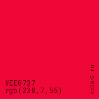 Цвет #EE0737 в цветовой модели RGB обозначается тремя октетами (238, 7, 55) в десятичном формате и #EE0737 в шестнадцатиричном (hex) формате, которые являются интенсивностью красного 238 (hex EE), интенсивность зелёного 7 (hex 07) и интенсивность синего 55 (hex 37).