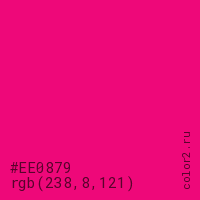 Цвет #EE0879 в цветовой модели RGB обозначается тремя октетами (238, 8, 121) в десятичном формате и #EE0879 в шестнадцатиричном (hex) формате, которые являются интенсивностью красного 238 (hex EE), интенсивность зелёного 8 (hex 08) и интенсивность синего 121 (hex 79).