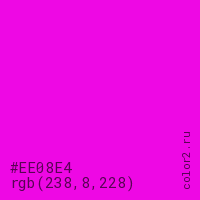 Цвет #EE08E4 в цветовой модели RGB обозначается тремя октетами (238, 8, 228) в десятичном формате и #EE08E4 в шестнадцатиричном (hex) формате, которые являются интенсивностью красного 238 (hex EE), интенсивность зелёного 8 (hex 08) и интенсивность синего 228 (hex E4).