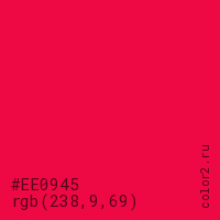 Цвет #EE0945 в цветовой модели RGB обозначается тремя октетами (238, 9, 69) в десятичном формате и #EE0945 в шестнадцатиричном (hex) формате, которые являются интенсивностью красного 238 (hex EE), интенсивность зелёного 9 (hex 09) и интенсивность синего 69 (hex 45).