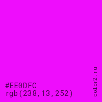 Цвет #EE0DFC в цветовой модели RGB обозначается тремя октетами (238, 13, 252) в десятичном формате и #EE0DFC в шестнадцатиричном (hex) формате, которые являются интенсивностью красного 238 (hex EE), интенсивность зелёного 13 (hex 0D) и интенсивность синего 252 (hex FC).