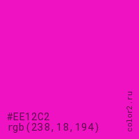 Цвет #EE12C2 в цветовой модели RGB обозначается тремя октетами (238, 18, 194) в десятичном формате и #EE12C2 в шестнадцатиричном (hex) формате, которые являются интенсивностью красного 238 (hex EE), интенсивность зелёного 18 (hex 12) и интенсивность синего 194 (hex C2).