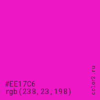 Цвет #EE17C6 в цветовой модели RGB обозначается тремя октетами (238, 23, 198) в десятичном формате и #EE17C6 в шестнадцатиричном (hex) формате, которые являются интенсивностью красного 238 (hex EE), интенсивность зелёного 23 (hex 17) и интенсивность синего 198 (hex C6).