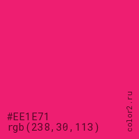Цвет #EE1E71 в цветовой модели RGB обозначается тремя октетами (238, 30, 113) в десятичном формате и #EE1E71 в шестнадцатиричном (hex) формате, которые являются интенсивностью красного 238 (hex EE), интенсивность зелёного 30 (hex 1E) и интенсивность синего 113 (hex 71).