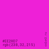 Цвет #EE20D7 в цветовой модели RGB обозначается тремя октетами (238, 32, 215) в десятичном формате и #EE20D7 в шестнадцатиричном (hex) формате, которые являются интенсивностью красного 238 (hex EE), интенсивность зелёного 32 (hex 20) и интенсивность синего 215 (hex D7).
