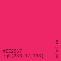 Цвет #EE2567 в цветовой модели RGB обозначается тремя октетами (238, 37, 103) в десятичном формате и #EE2567 в шестнадцатиричном (hex) формате, которые являются интенсивностью красного 238 (hex EE), интенсивность зелёного 37 (hex 25) и интенсивность синего 103 (hex 67).