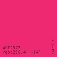 Цвет #EE2972 в цветовой модели RGB обозначается тремя октетами (238, 41, 114) в десятичном формате и #EE2972 в шестнадцатиричном (hex) формате, которые являются интенсивностью красного 238 (hex EE), интенсивность зелёного 41 (hex 29) и интенсивность синего 114 (hex 72).