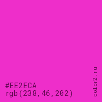 Цвет #EE2ECA в цветовой модели RGB обозначается тремя октетами (238, 46, 202) в десятичном формате и #EE2ECA в шестнадцатиричном (hex) формате, которые являются интенсивностью красного 238 (hex EE), интенсивность зелёного 46 (hex 2E) и интенсивность синего 202 (hex CA).
