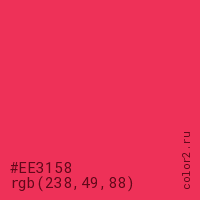 Цвет #EE3158 в цветовой модели RGB обозначается тремя октетами (238, 49, 88) в десятичном формате и #EE3158 в шестнадцатиричном (hex) формате, которые являются интенсивностью красного 238 (hex EE), интенсивность зелёного 49 (hex 31) и интенсивность синего 88 (hex 58).