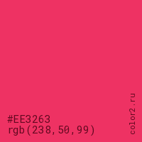 Цвет #EE3263 в цветовой модели RGB обозначается тремя октетами (238, 50, 99) в десятичном формате и #EE3263 в шестнадцатиричном (hex) формате, которые являются интенсивностью красного 238 (hex EE), интенсивность зелёного 50 (hex 32) и интенсивность синего 99 (hex 63).