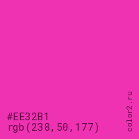 Цвет #EE32B1 в цветовой модели RGB обозначается тремя октетами (238, 50, 177) в десятичном формате и #EE32B1 в шестнадцатиричном (hex) формате, которые являются интенсивностью красного 238 (hex EE), интенсивность зелёного 50 (hex 32) и интенсивность синего 177 (hex B1).