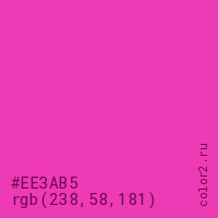 Цвет #EE3AB5 в цветовой модели RGB обозначается тремя октетами (238, 58, 181) в десятичном формате и #EE3AB5 в шестнадцатиричном (hex) формате, которые являются интенсивностью красного 238 (hex EE), интенсивность зелёного 58 (hex 3A) и интенсивность синего 181 (hex B5).