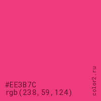 Цвет #EE3B7C в цветовой модели RGB обозначается тремя октетами (238, 59, 124) в десятичном формате и #EE3B7C в шестнадцатиричном (hex) формате, которые являются интенсивностью красного 238 (hex EE), интенсивность зелёного 59 (hex 3B) и интенсивность синего 124 (hex 7C).