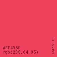 Цвет #EE405F в цветовой модели RGB обозначается тремя октетами (238, 64, 95) в десятичном формате и #EE405F в шестнадцатиричном (hex) формате, которые являются интенсивностью красного 238 (hex EE), интенсивность зелёного 64 (hex 40) и интенсивность синего 95 (hex 5F).