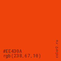 Цвет #EE430A в цветовой модели RGB обозначается тремя октетами (238, 67, 10) в десятичном формате и #EE430A в шестнадцатиричном (hex) формате, которые являются интенсивностью красного 238 (hex EE), интенсивность зелёного 67 (hex 43) и интенсивность синего 10 (hex 0A).