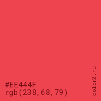 Цвет #EE444F в цветовой модели RGB обозначается тремя октетами (238, 68, 79) в десятичном формате и #EE444F в шестнадцатиричном (hex) формате, которые являются интенсивностью красного 238 (hex EE), интенсивность зелёного 68 (hex 44) и интенсивность синего 79 (hex 4F).