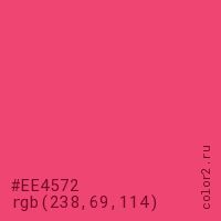 Цвет #EE4572 в цветовой модели RGB обозначается тремя октетами (238, 69, 114) в десятичном формате и #EE4572 в шестнадцатиричном (hex) формате, которые являются интенсивностью красного 238 (hex EE), интенсивность зелёного 69 (hex 45) и интенсивность синего 114 (hex 72).