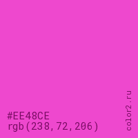 Цвет #EE48CE в цветовой модели RGB обозначается тремя октетами (238, 72, 206) в десятичном формате и #EE48CE в шестнадцатиричном (hex) формате, которые являются интенсивностью красного 238 (hex EE), интенсивность зелёного 72 (hex 48) и интенсивность синего 206 (hex CE).