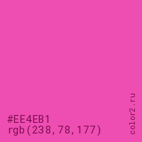 Цвет #EE4EB1 в цветовой модели RGB обозначается тремя октетами (238, 78, 177) в десятичном формате и #EE4EB1 в шестнадцатиричном (hex) формате, которые являются интенсивностью красного 238 (hex EE), интенсивность зелёного 78 (hex 4E) и интенсивность синего 177 (hex B1).