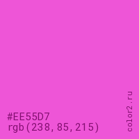 Цвет #EE55D7 в цветовой модели RGB обозначается тремя октетами (238, 85, 215) в десятичном формате и #EE55D7 в шестнадцатиричном (hex) формате, которые являются интенсивностью красного 238 (hex EE), интенсивность зелёного 85 (hex 55) и интенсивность синего 215 (hex D7).