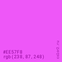 Цвет #EE57F8 в цветовой модели RGB обозначается тремя октетами (238, 87, 248) в десятичном формате и #EE57F8 в шестнадцатиричном (hex) формате, которые являются интенсивностью красного 238 (hex EE), интенсивность зелёного 87 (hex 57) и интенсивность синего 248 (hex F8).