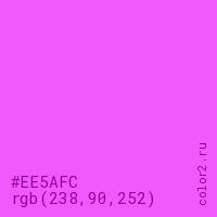 Цвет #EE5AFC в цветовой модели RGB обозначается тремя октетами (238, 90, 252) в десятичном формате и #EE5AFC в шестнадцатиричном (hex) формате, которые являются интенсивностью красного 238 (hex EE), интенсивность зелёного 90 (hex 5A) и интенсивность синего 252 (hex FC).