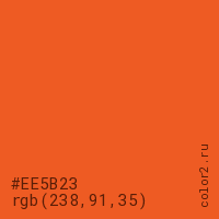 Цвет #EE5B23 в цветовой модели RGB обозначается тремя октетами (238, 91, 35) в десятичном формате и #EE5B23 в шестнадцатиричном (hex) формате, которые являются интенсивностью красного 238 (hex EE), интенсивность зелёного 91 (hex 5B) и интенсивность синего 35 (hex 23).