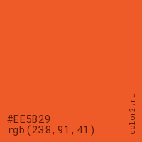 Цвет #EE5B29 в цветовой модели RGB обозначается тремя октетами (238, 91, 41) в десятичном формате и #EE5B29 в шестнадцатиричном (hex) формате, которые являются интенсивностью красного 238 (hex EE), интенсивность зелёного 91 (hex 5B) и интенсивность синего 41 (hex 29).