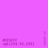 Цвет #EE5CFF в цветовой модели RGB обозначается тремя октетами (238, 92, 255) в десятичном формате и #EE5CFF в шестнадцатиричном (hex) формате, которые являются интенсивностью красного 238 (hex EE), интенсивность зелёного 92 (hex 5C) и интенсивность синего 255 (hex FF).