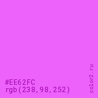 Цвет #EE62FC в цветовой модели RGB обозначается тремя октетами (238, 98, 252) в десятичном формате и #EE62FC в шестнадцатиричном (hex) формате, которые являются интенсивностью красного 238 (hex EE), интенсивность зелёного 98 (hex 62) и интенсивность синего 252 (hex FC).