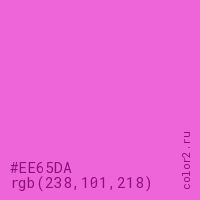Цвет #EE65DA в цветовой модели RGB обозначается тремя октетами (238, 101, 218) в десятичном формате и #EE65DA в шестнадцатиричном (hex) формате, которые являются интенсивностью красного 238 (hex EE), интенсивность зелёного 101 (hex 65) и интенсивность синего 218 (hex DA).