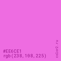 Цвет #EE6CE1 в цветовой модели RGB обозначается тремя октетами (238, 108, 225) в десятичном формате и #EE6CE1 в шестнадцатиричном (hex) формате, которые являются интенсивностью красного 238 (hex EE), интенсивность зелёного 108 (hex 6C) и интенсивность синего 225 (hex E1).