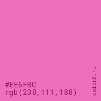 Цвет #EE6FBC в цветовой модели RGB обозначается тремя октетами (238, 111, 188) в десятичном формате и #EE6FBC в шестнадцатиричном (hex) формате, которые являются интенсивностью красного 238 (hex EE), интенсивность зелёного 111 (hex 6F) и интенсивность синего 188 (hex BC).