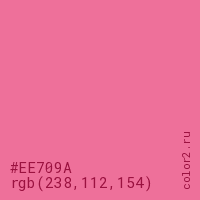 Цвет #EE709A в цветовой модели RGB обозначается тремя октетами (238, 112, 154) в десятичном формате и #EE709A в шестнадцатиричном (hex) формате, которые являются интенсивностью красного 238 (hex EE), интенсивность зелёного 112 (hex 70) и интенсивность синего 154 (hex 9A).