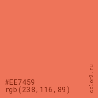 Цвет #EE7459 в цветовой модели RGB обозначается тремя октетами (238, 116, 89) в десятичном формате и #EE7459 в шестнадцатиричном (hex) формате, которые являются интенсивностью красного 238 (hex EE), интенсивность зелёного 116 (hex 74) и интенсивность синего 89 (hex 59).