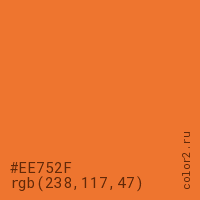 Цвет #EE752F в цветовой модели RGB обозначается тремя октетами (238, 117, 47) в десятичном формате и #EE752F в шестнадцатиричном (hex) формате, которые являются интенсивностью красного 238 (hex EE), интенсивность зелёного 117 (hex 75) и интенсивность синего 47 (hex 2F).