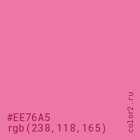 Цвет #EE76A5 в цветовой модели RGB обозначается тремя октетами (238, 118, 165) в десятичном формате и #EE76A5 в шестнадцатиричном (hex) формате, которые являются интенсивностью красного 238 (hex EE), интенсивность зелёного 118 (hex 76) и интенсивность синего 165 (hex A5).