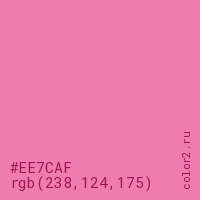 Цвет #EE7CAF в цветовой модели RGB обозначается тремя октетами (238, 124, 175) в десятичном формате и #EE7CAF в шестнадцатиричном (hex) формате, которые являются интенсивностью красного 238 (hex EE), интенсивность зелёного 124 (hex 7C) и интенсивность синего 175 (hex AF).