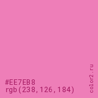 Цвет #EE7EB8 в цветовой модели RGB обозначается тремя октетами (238, 126, 184) в десятичном формате и #EE7EB8 в шестнадцатиричном (hex) формате, которые являются интенсивностью красного 238 (hex EE), интенсивность зелёного 126 (hex 7E) и интенсивность синего 184 (hex B8).